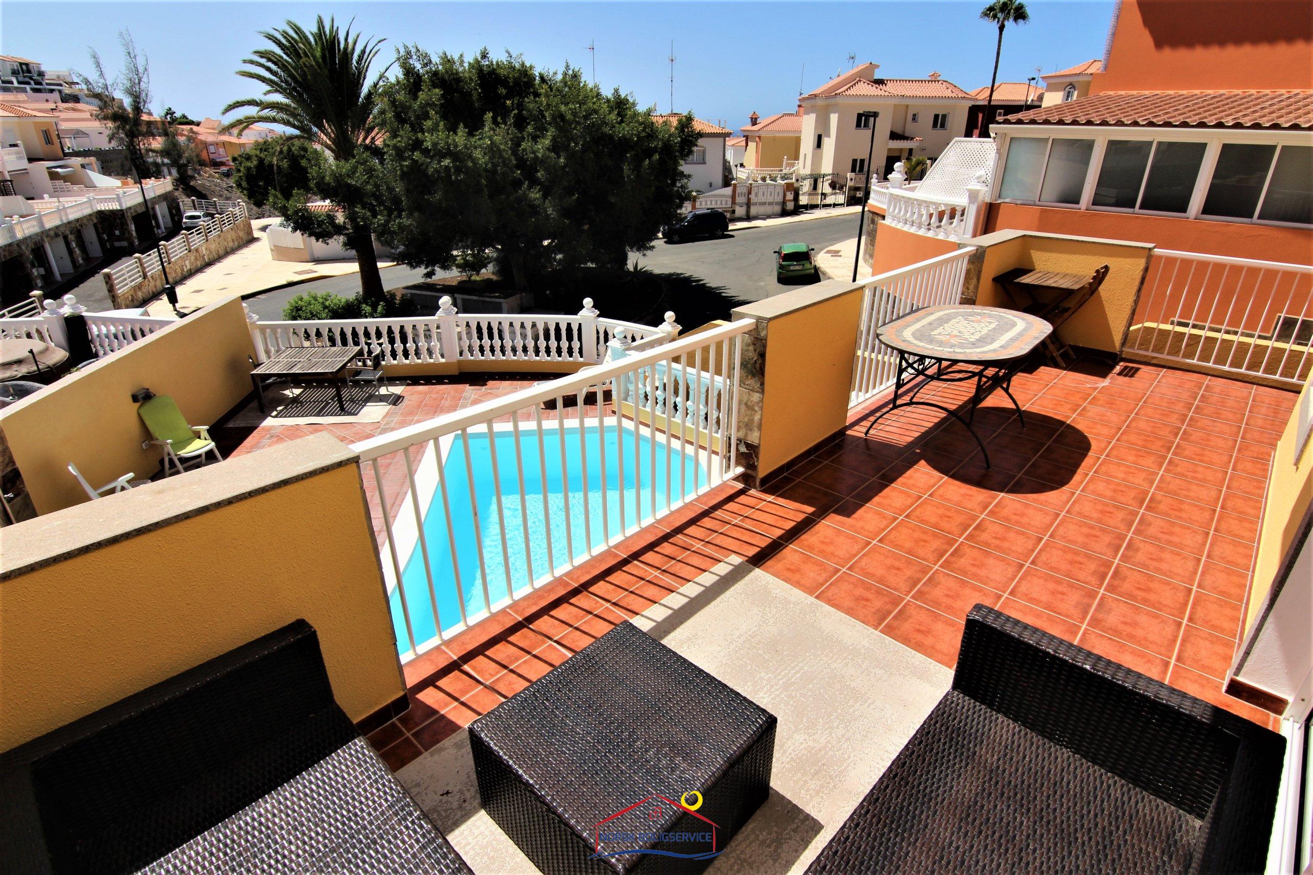 1 vakker terrasse rundt husetDet har et stort svømmebasseng og er flislagt med rustikke brune fliser. Det er rikelig med utemøbler og solsenger på terrassen, og på baksiden er det en hage med planter og busker som er enkle å holde ved like.