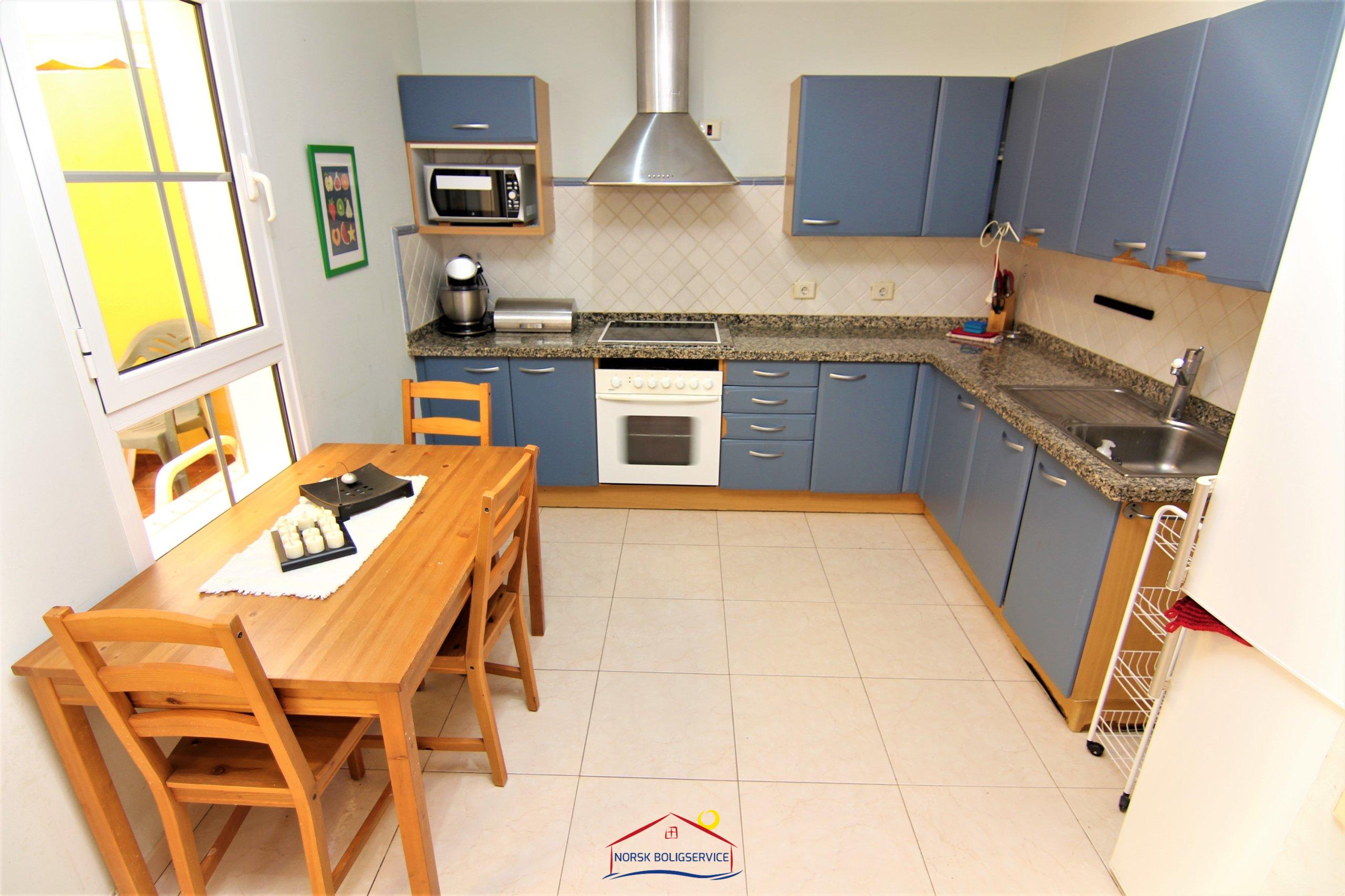 1 utstyrt kjøkken med blå skap og skuffer. Det er fullt utstyrt med kjøleskap, kokeplater, stekeovn og mikrobølgeovn. Rommet er stort og lyst, med god plass til å sitte og spise.